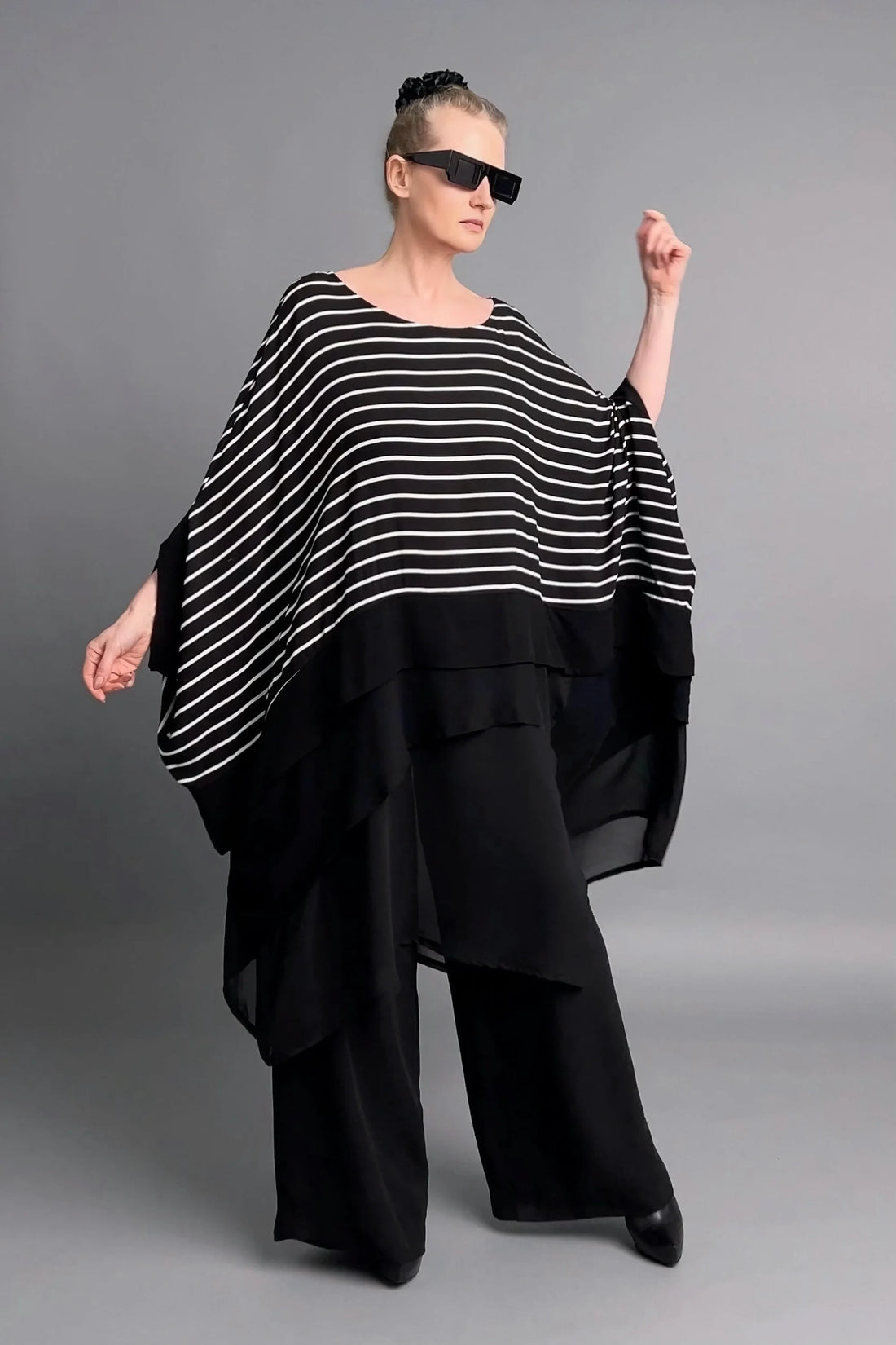 Maxlive Oversize-Bluse im Schwarz-Weiß-Streifenmuster mit asymmetrischem Lagenlook