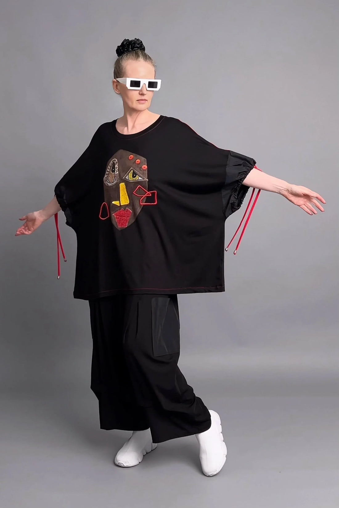 Oversize-Bluse mit Gesichtsapplikation und roten Akzenten aus Viskose von Maxlive in Schwarz