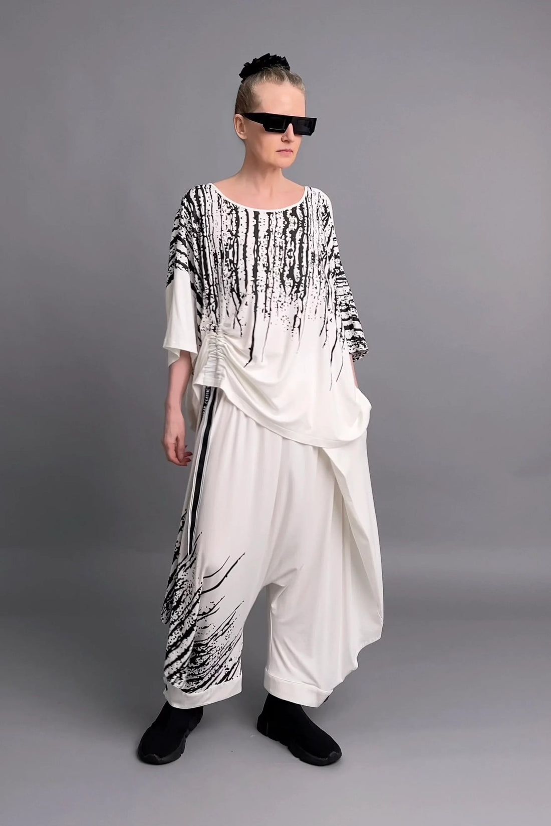 Avantgarde Set Shirt & Hose mit Kunstprint in Weiß-Schwarz aus Viskose von Riberance