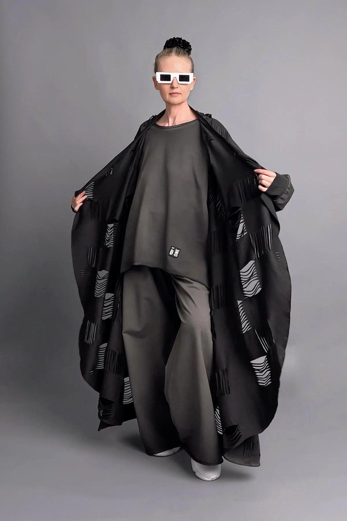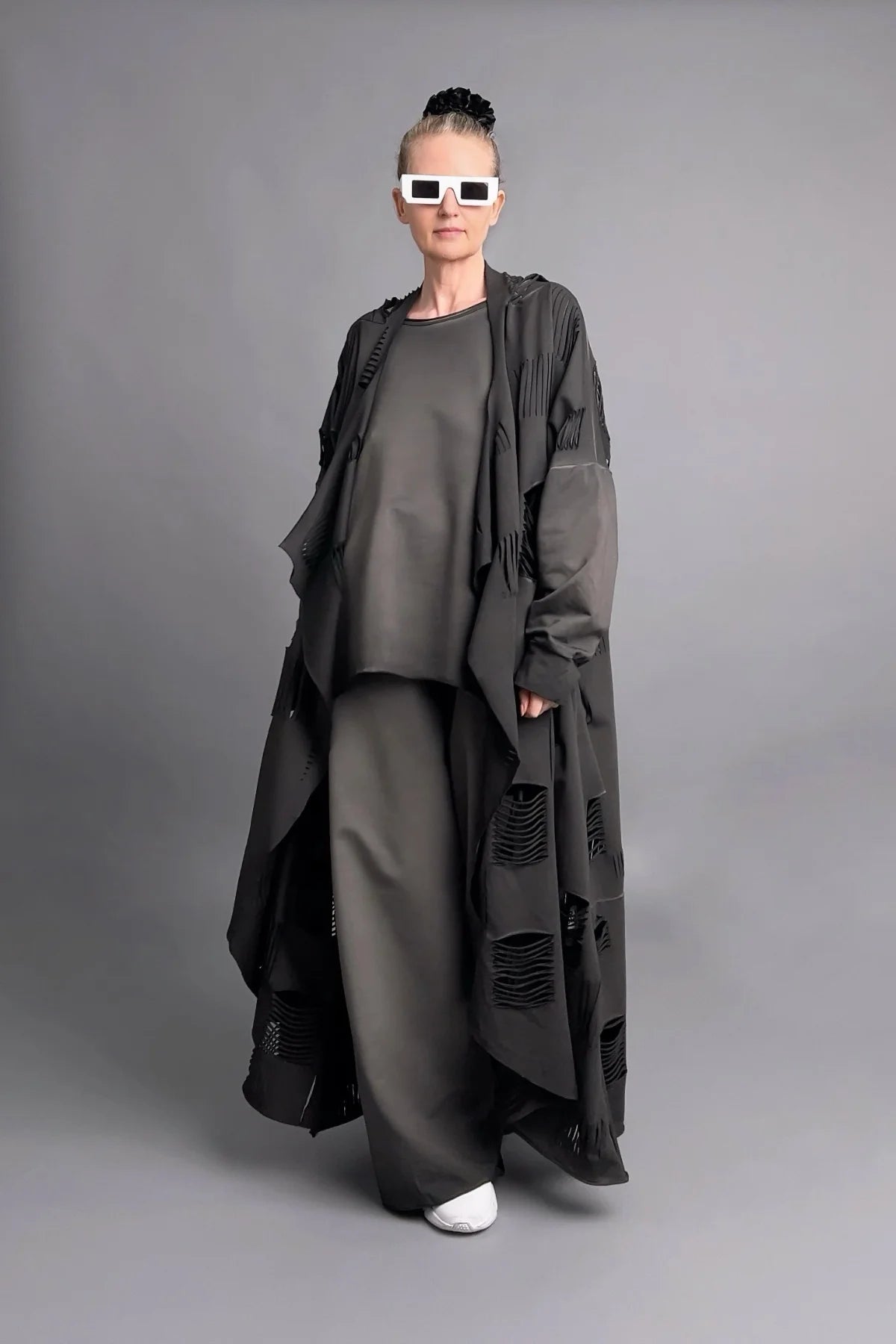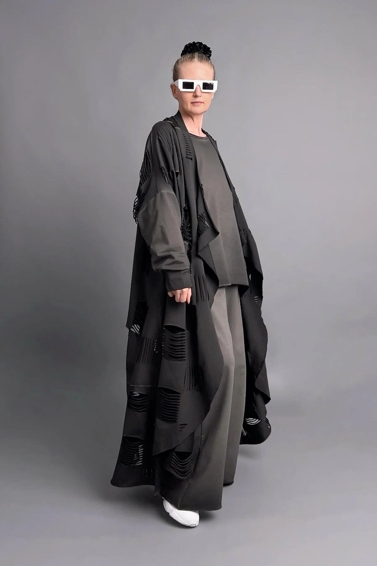 Ein Statement in dunkler Eleganz: Das dreiteilige Set aus Shirt, Hose und Cardigan von B-One vereint avantgardistisches Design mit komfortabler Oversize-Silhouette. Weicher, schwerer French Terry sorgt für Struktur und fließende Bewegung – perfekt für den Übergang und ein selbstbewusstes Styling im Lagenlook.
