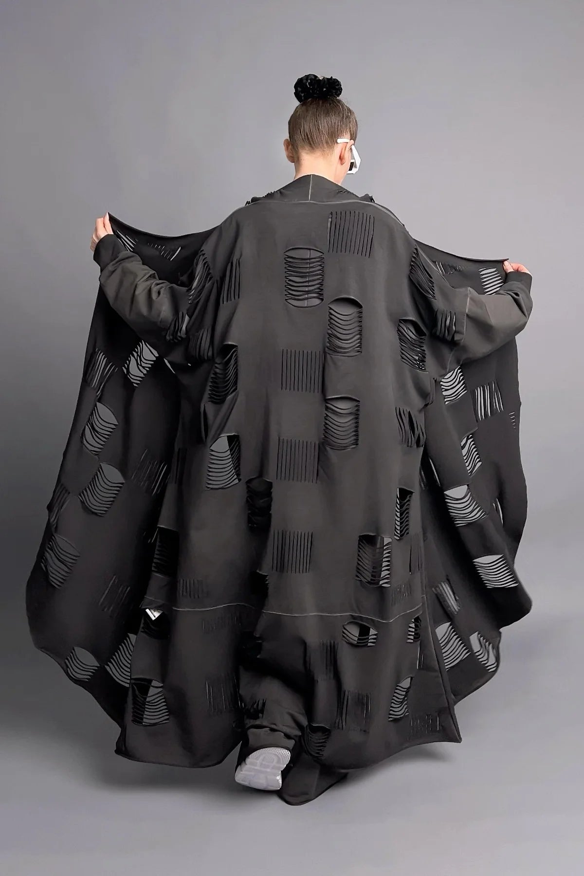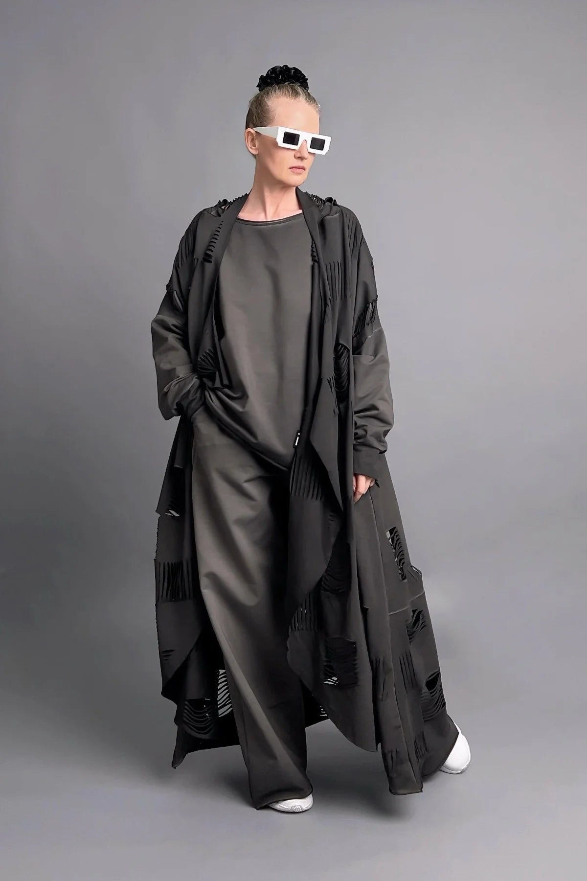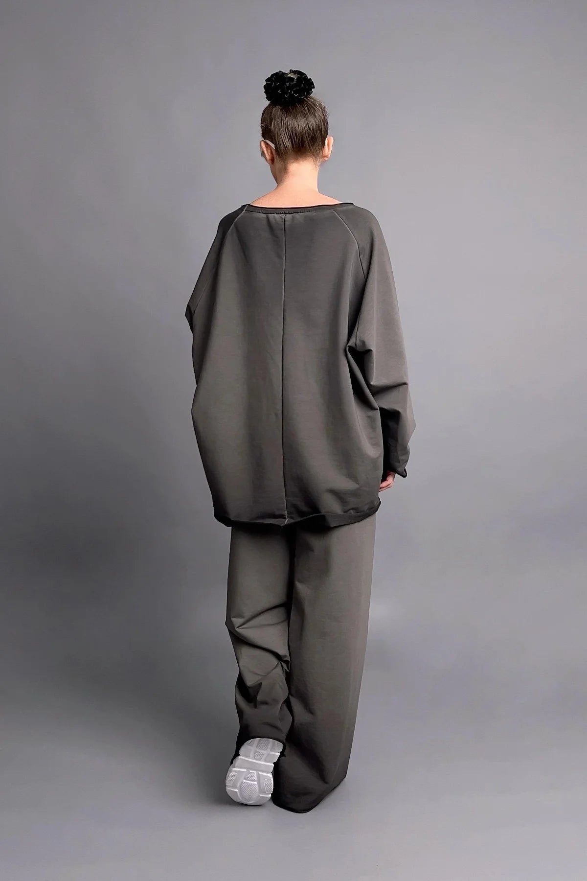 Ein Statement in dunkler Eleganz: Das dreiteilige Set aus Shirt, Hose und Cardigan von B-One vereint avantgardistisches Design mit komfortabler Oversize-Silhouette. Weicher, schwerer French Terry sorgt für Struktur und fließende Bewegung – perfekt für den Übergang und ein selbstbewusstes Styling im Lagenlook.