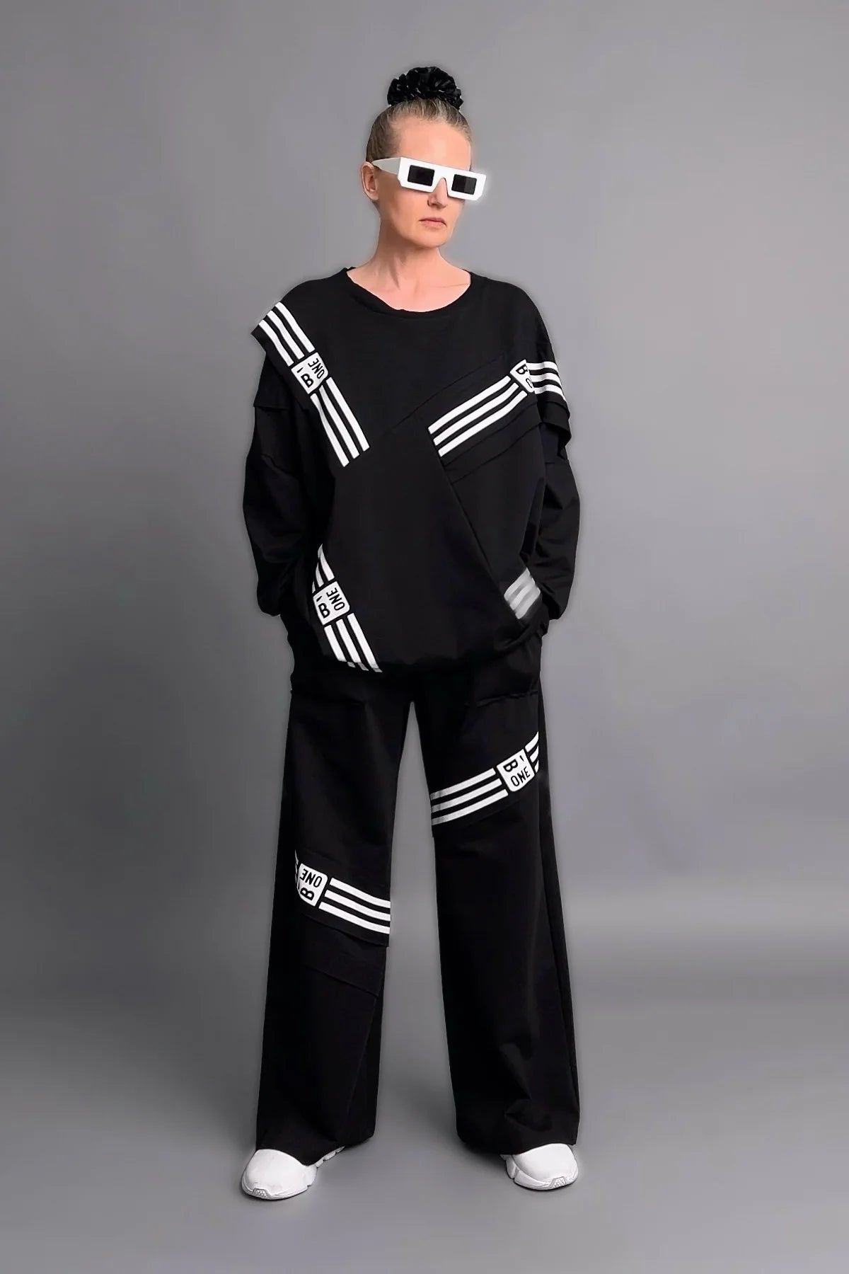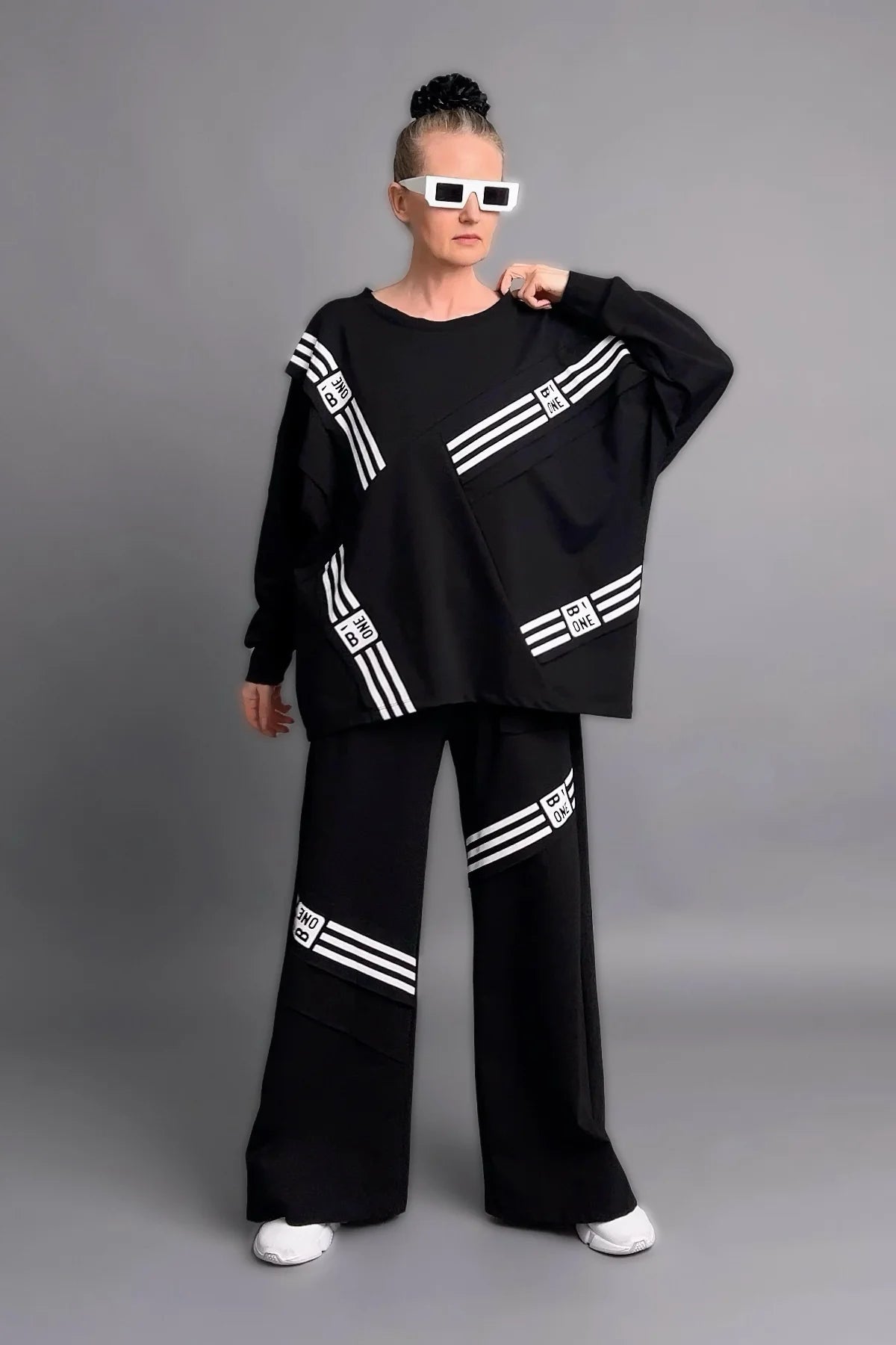 Schwarz-weißer Oversize-Zweiteiler mit grafischen Streifenprints aus weichem French Terry