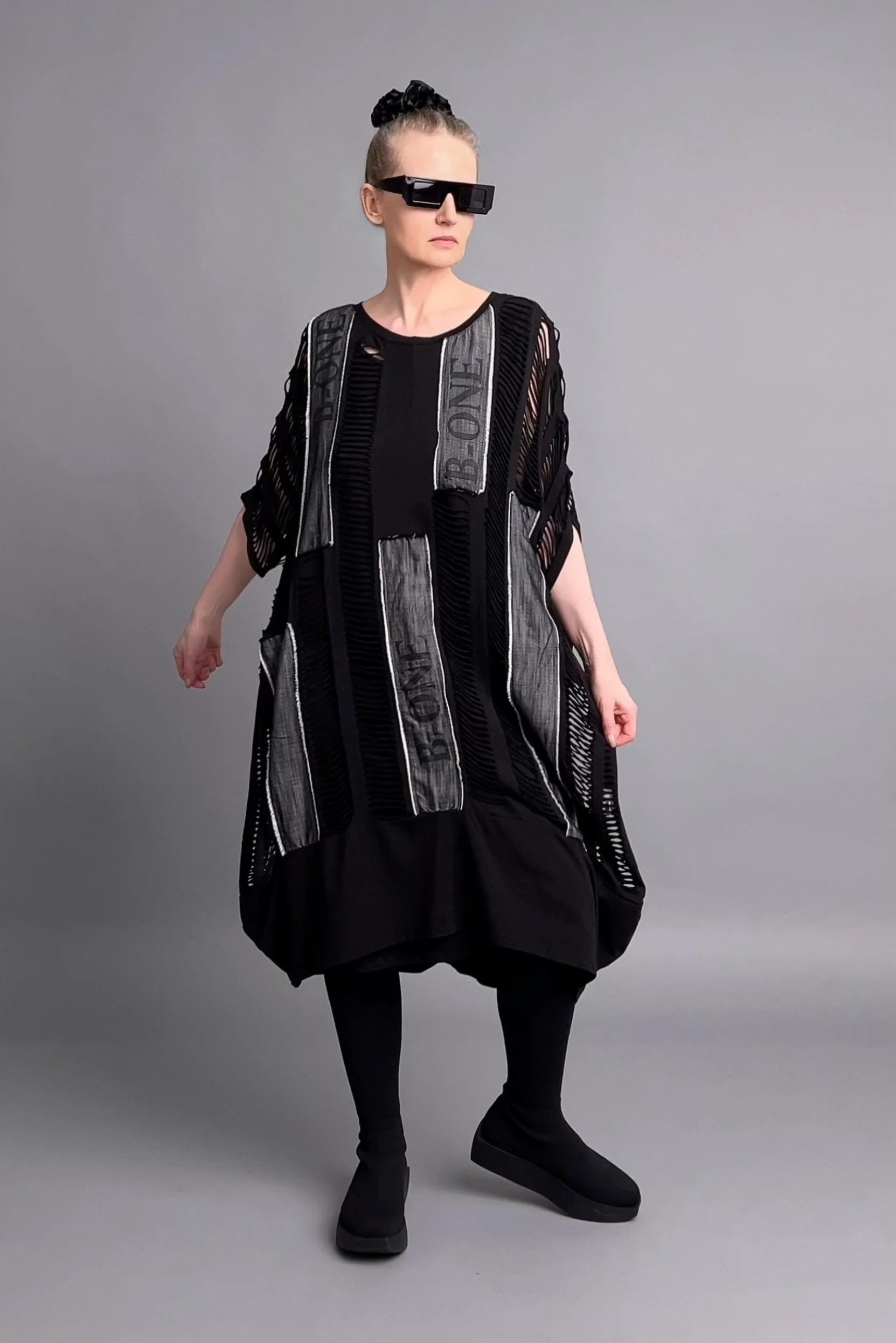 Stark, individuell und voller Ausdruck – dieses zweiteilige Kleid von B-ONE vereint ein blickdichtes Unterkleid mit einem transparent-luftigen Oberkleid im Layer-Look. Cut-Outs, kontrastierende Streifen und weite Oversize-Silhouette ergeben ein Kunstwerk moderner Mode – für Frauen, die avantgardistisch denken und sich so fühlen wollen.
