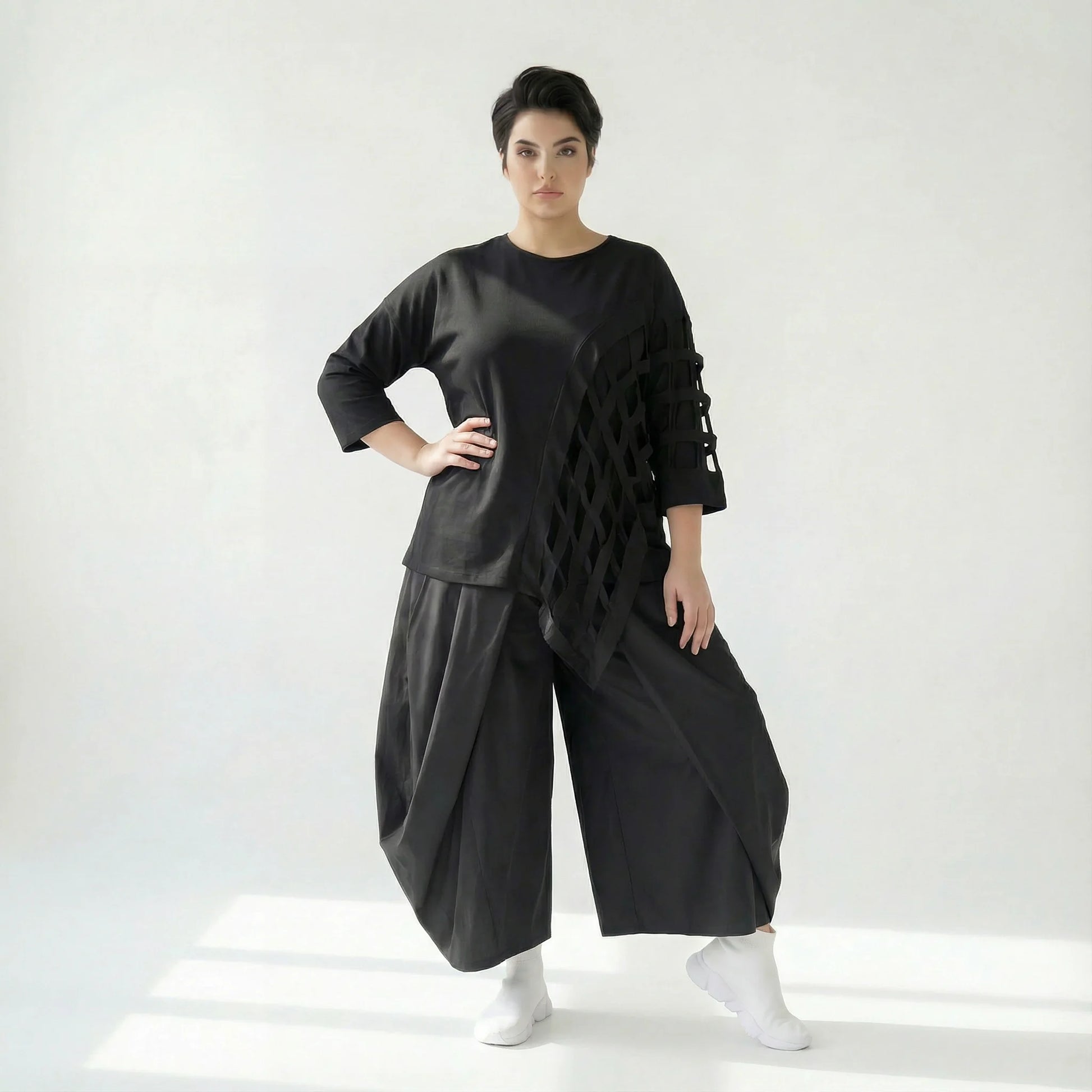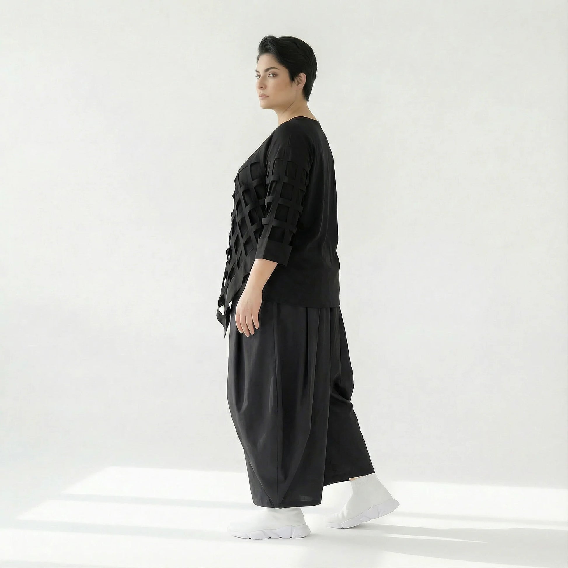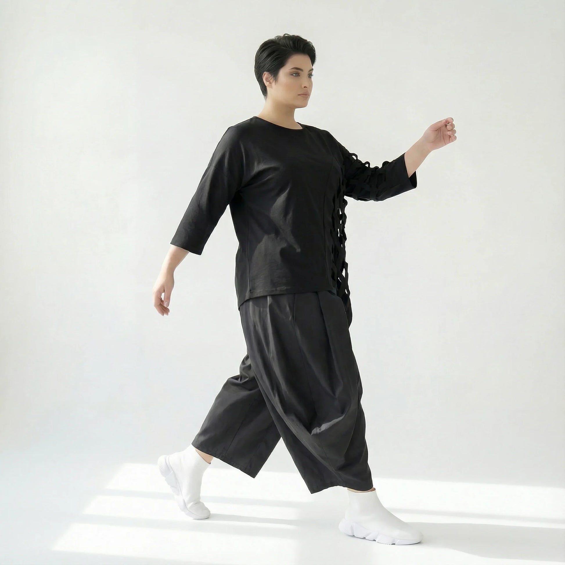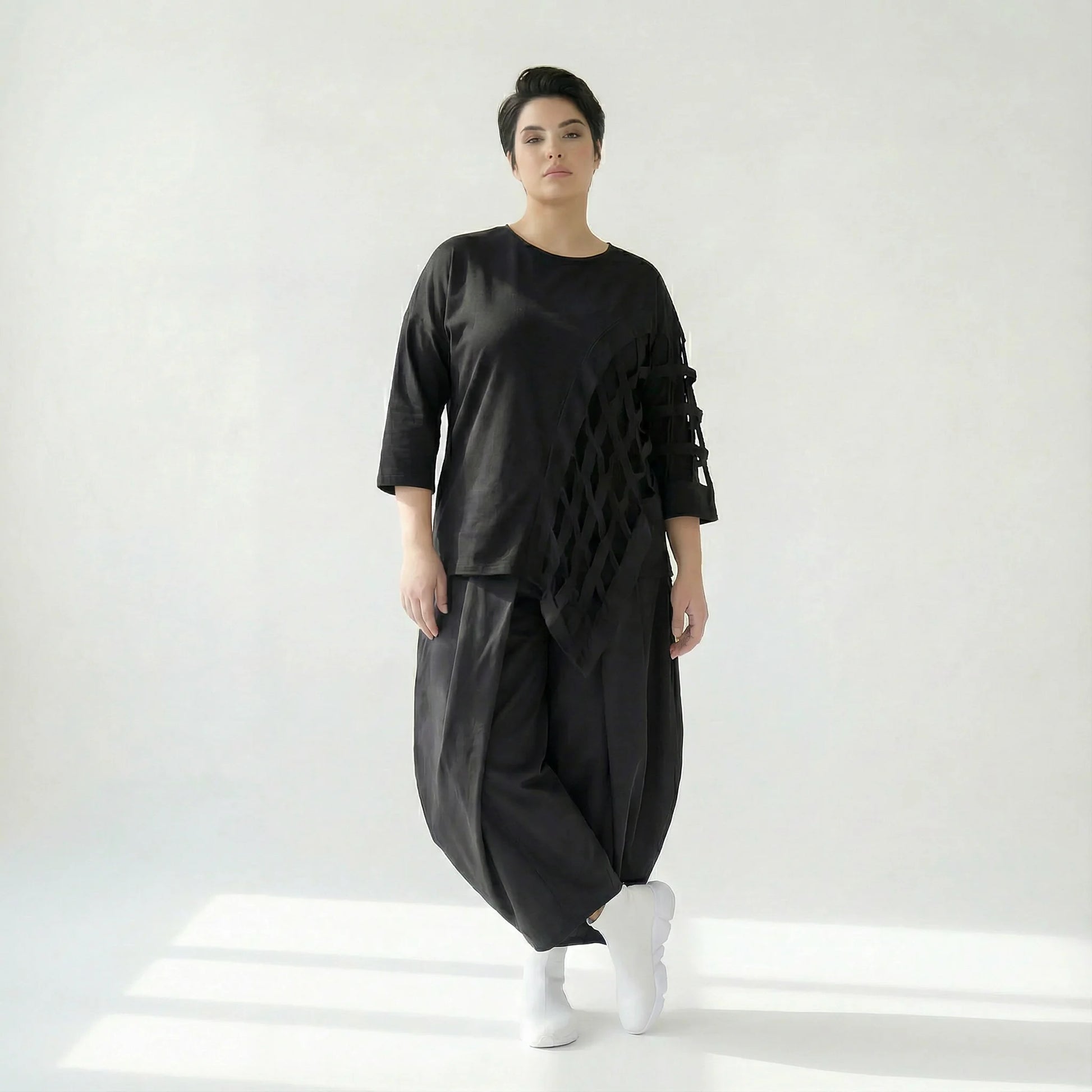 Diese außergewöhnliche Ballonhose vereint avantgardistische Klarheit mit fließender Leichtigkeit und unterstreicht den kuratorischen Anspruch von Modeare. Der sehr weite, ballonartige Schnitt sorgt für maximale Bewegungsfreiheit und eine markante Silhouette. Asymmetrische Drapierungen und die Wickel-Optik verleihen dem Design Tiefe und Dynamik, während die fein gewebte Baumwollpopeline mit glatt-matter Oberfläche angenehm luftig auf der Haut liegt – ideal für stilvolle Lagenlooks mit architektonischem Charakter.