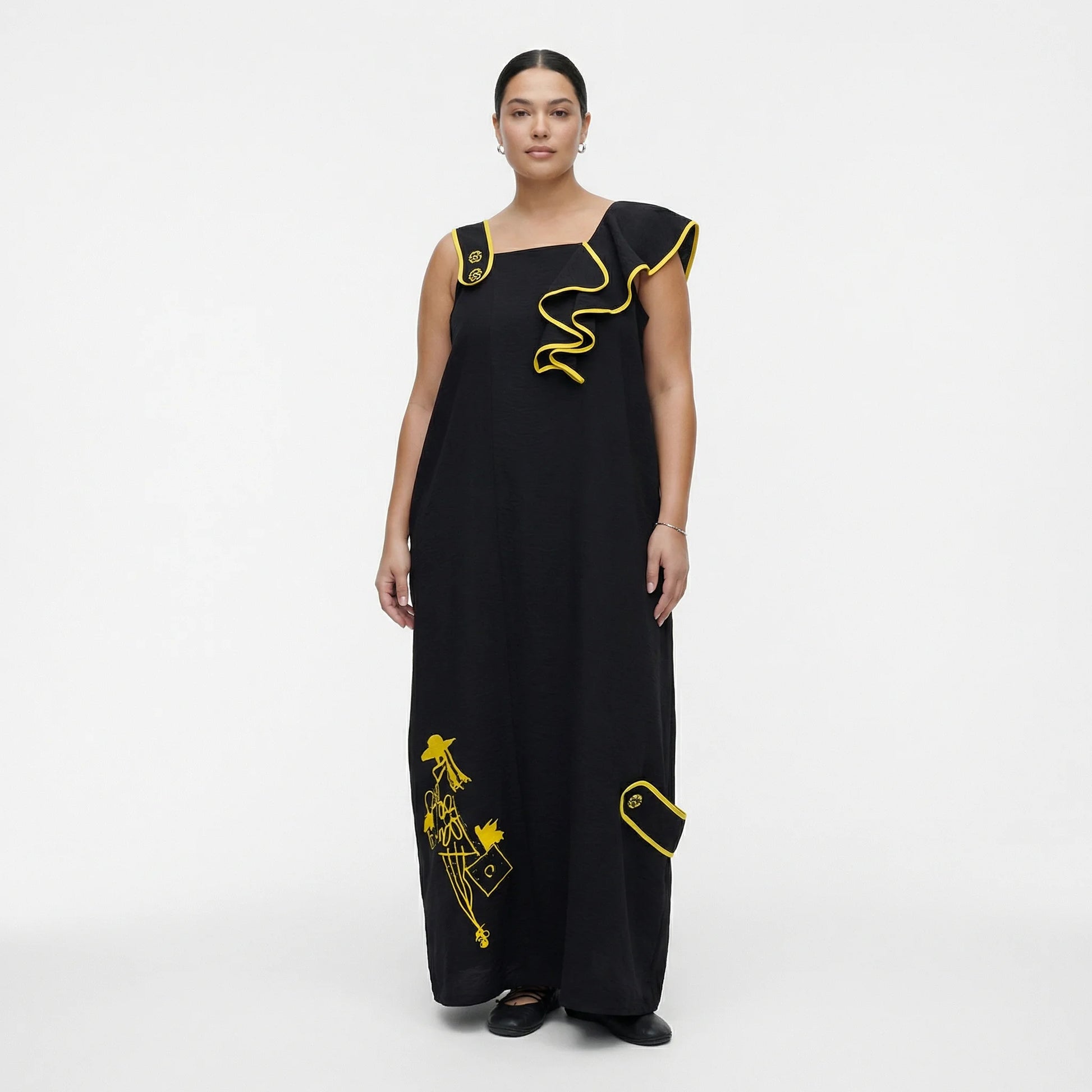 Schwarzes Maxikleid mit gelben Details und Avantgarde-Akzenten von LUANI im Oversize-Look
