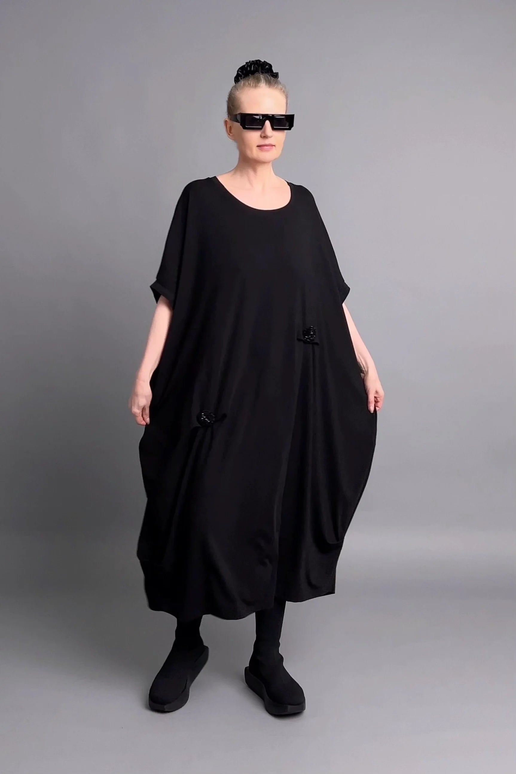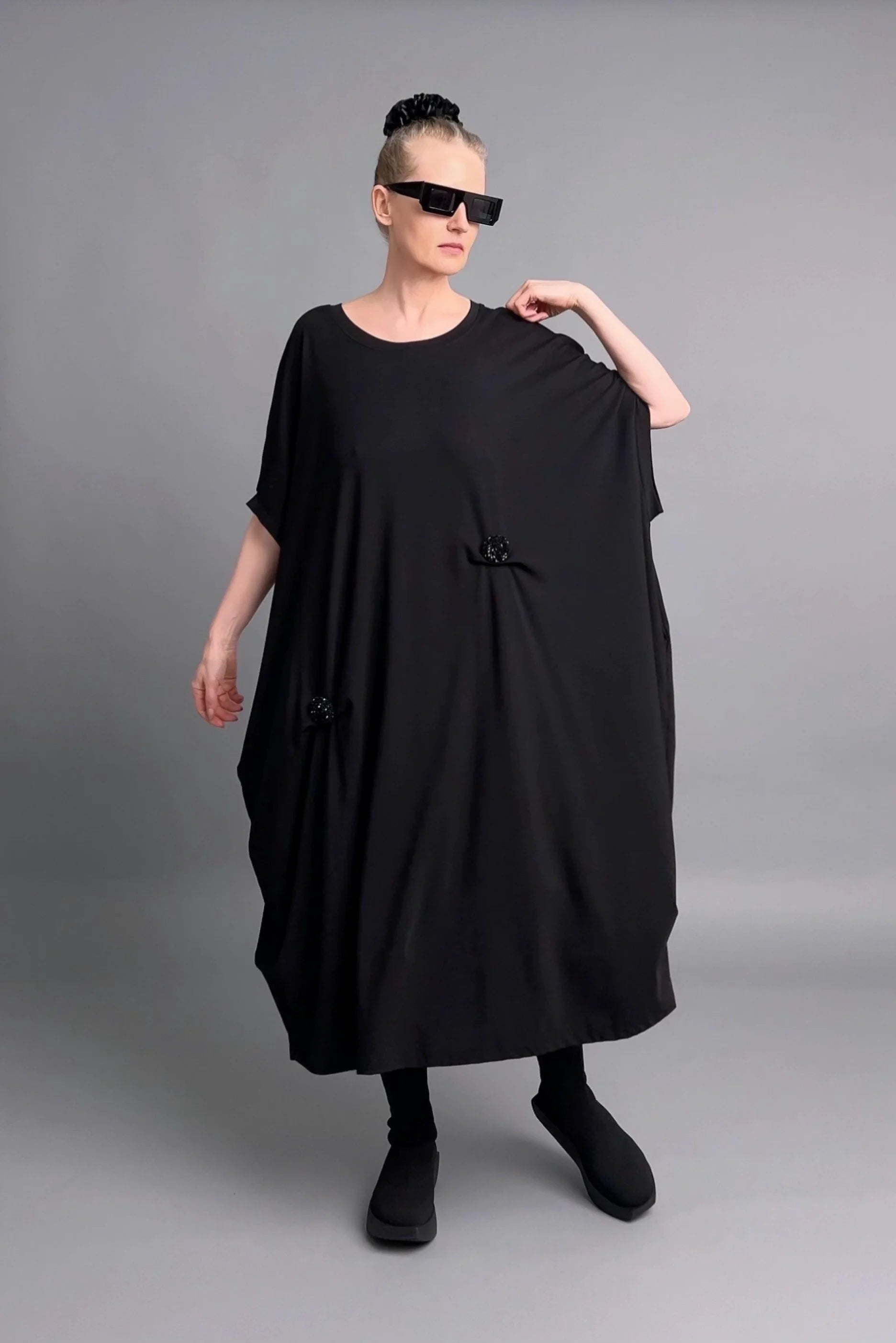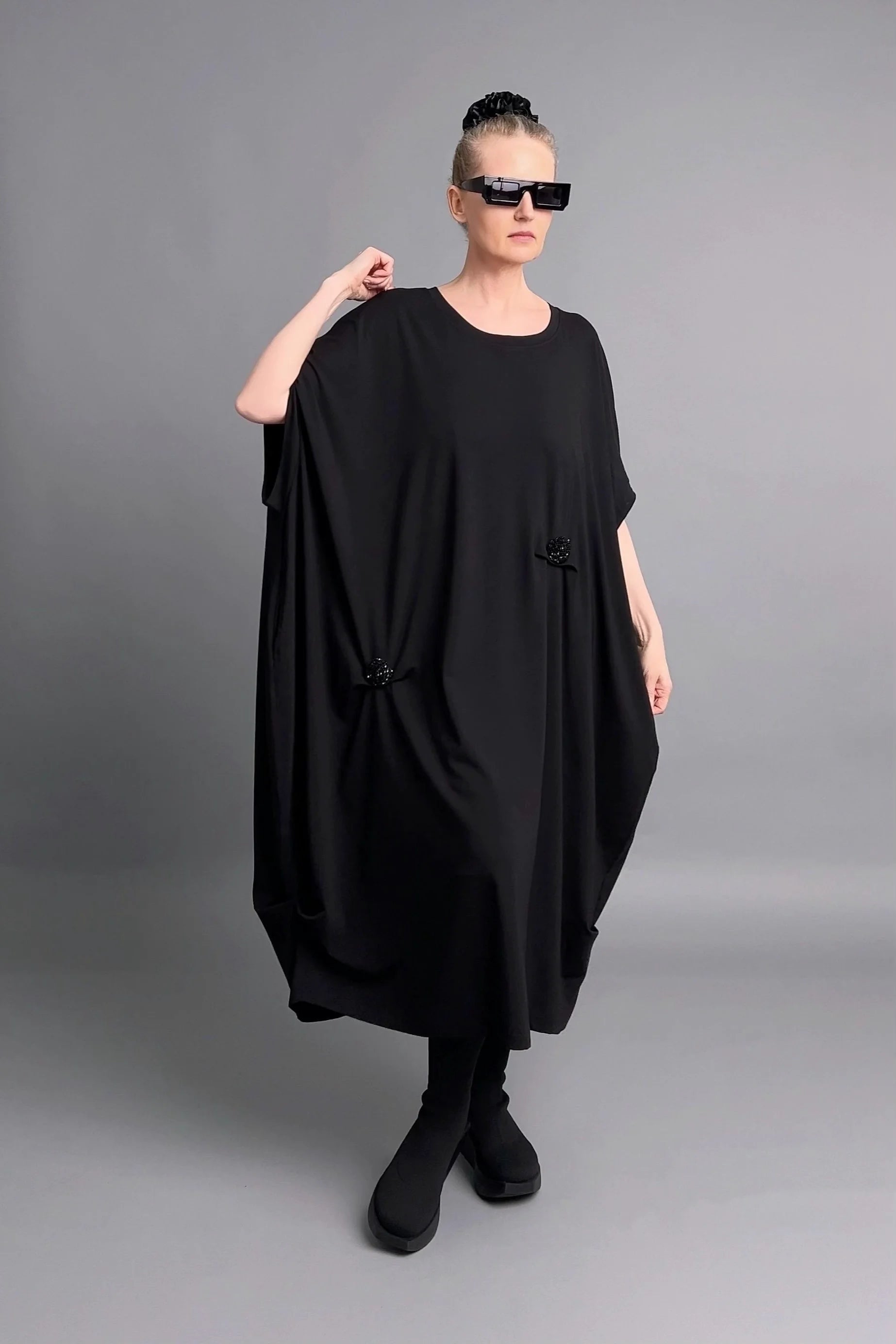 Avantgarde-Kleid in Schwarz mit Drapierung und Blütendetails von Maxlive im Oversize-Look