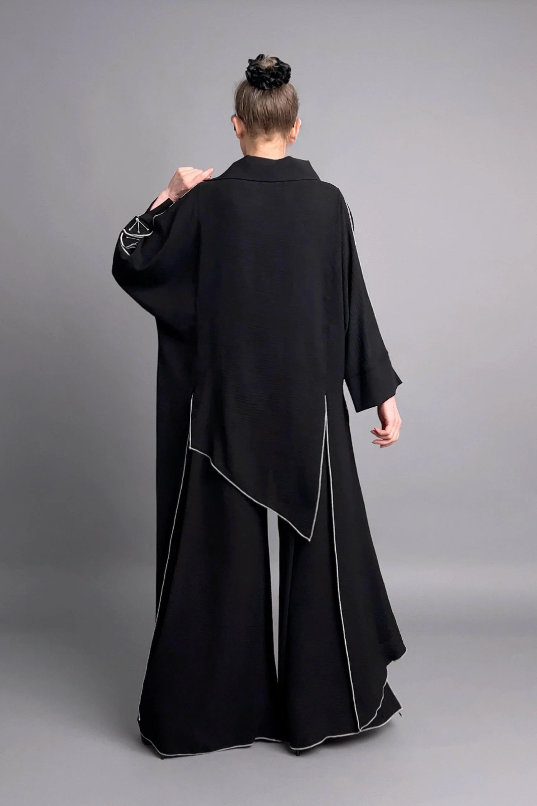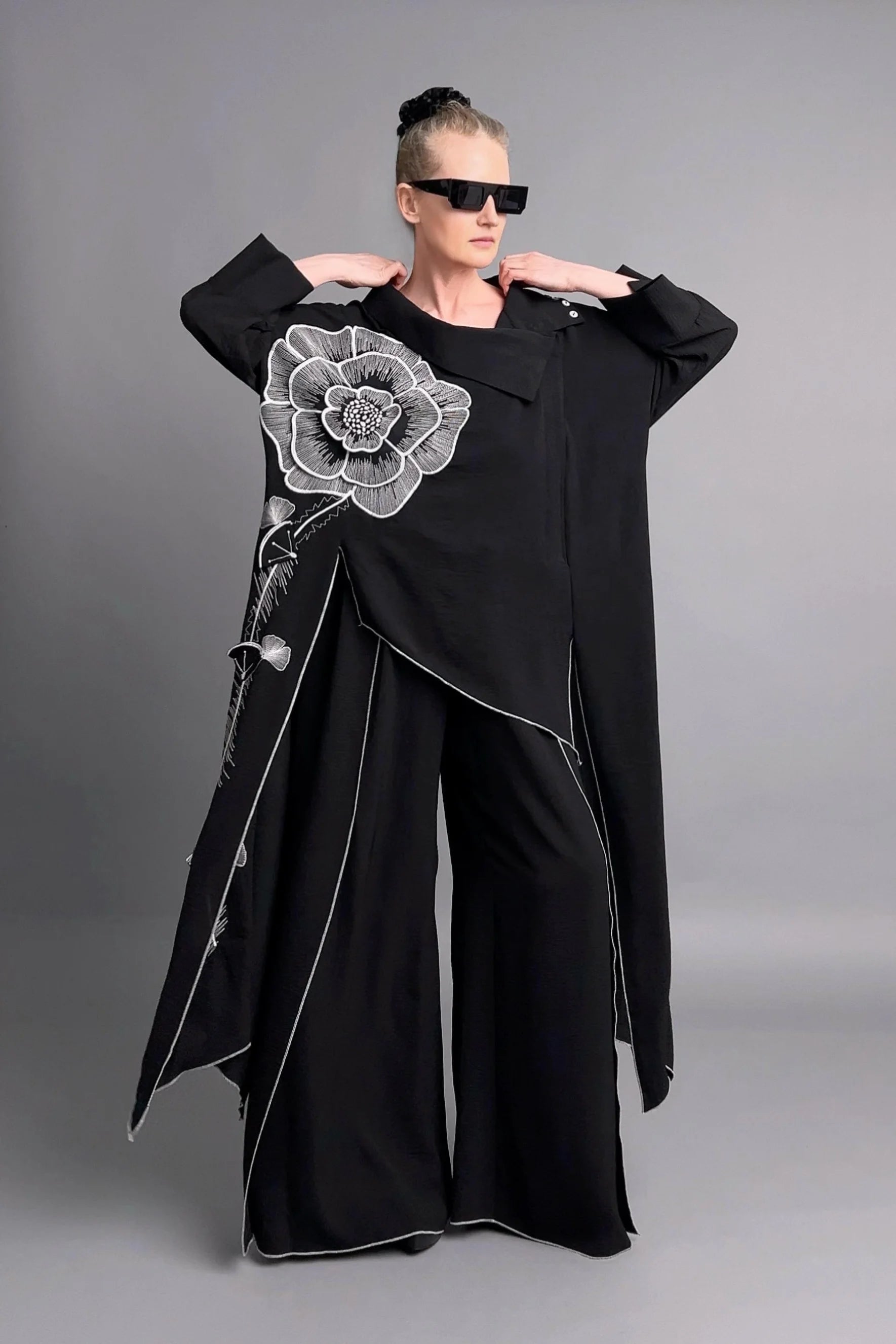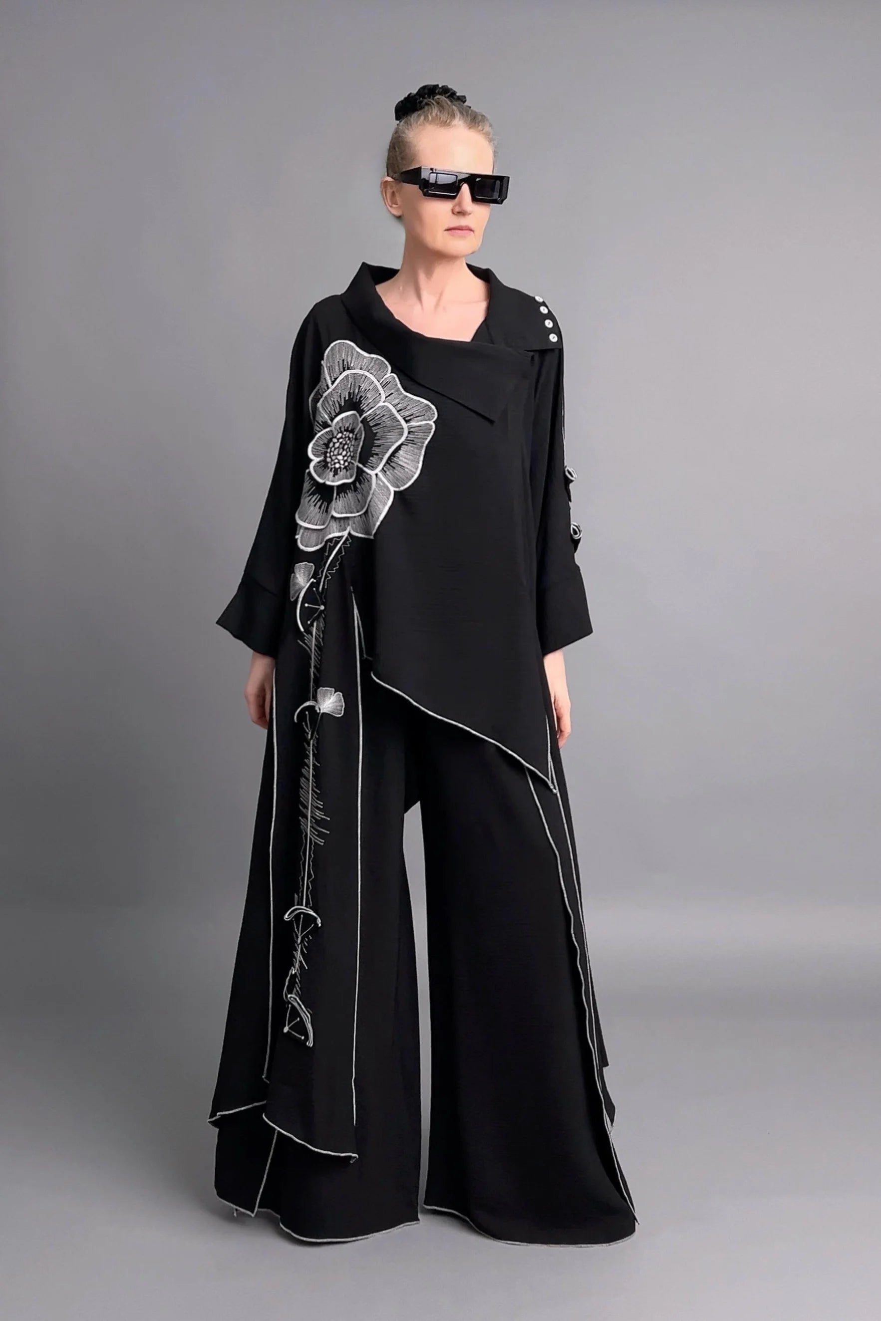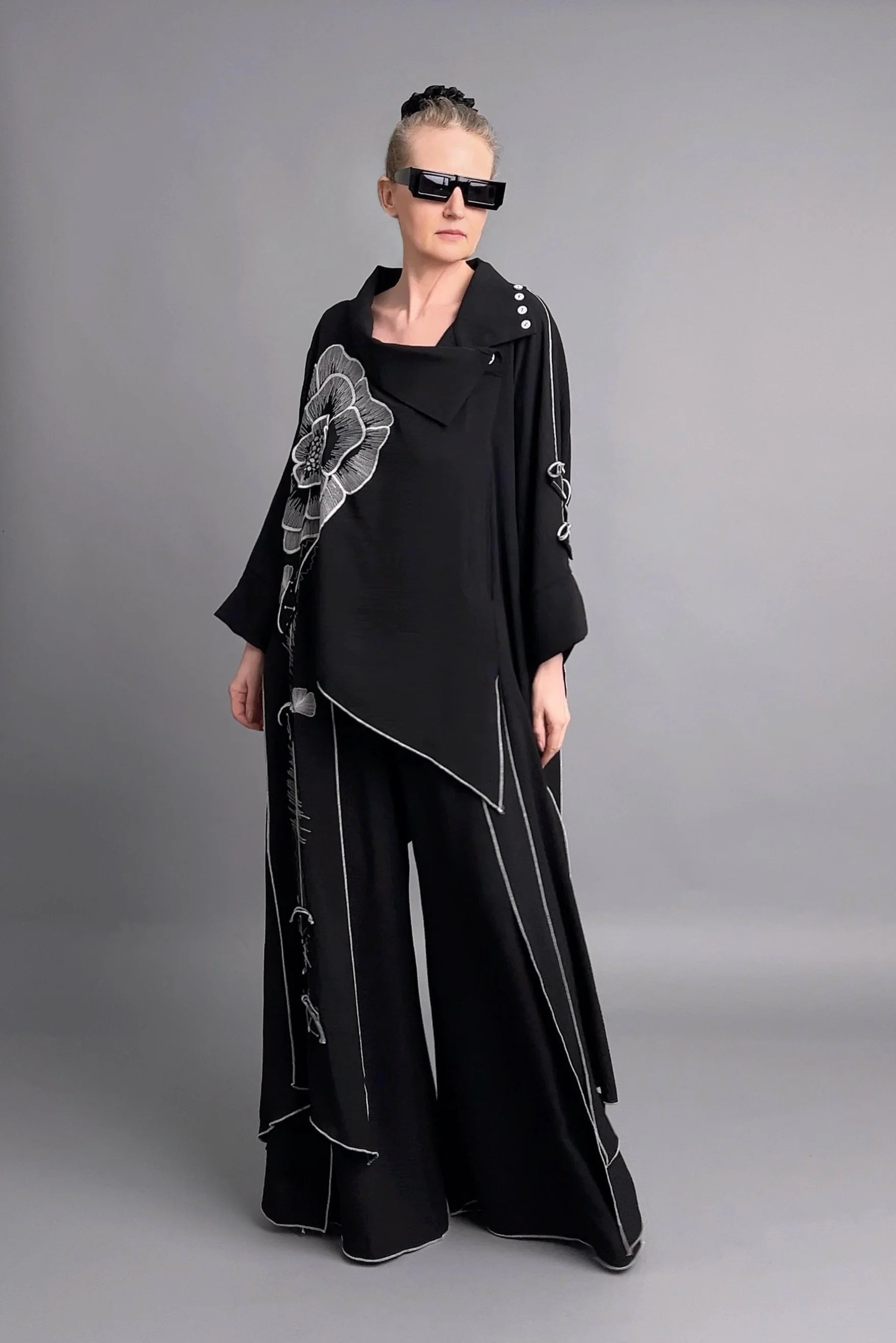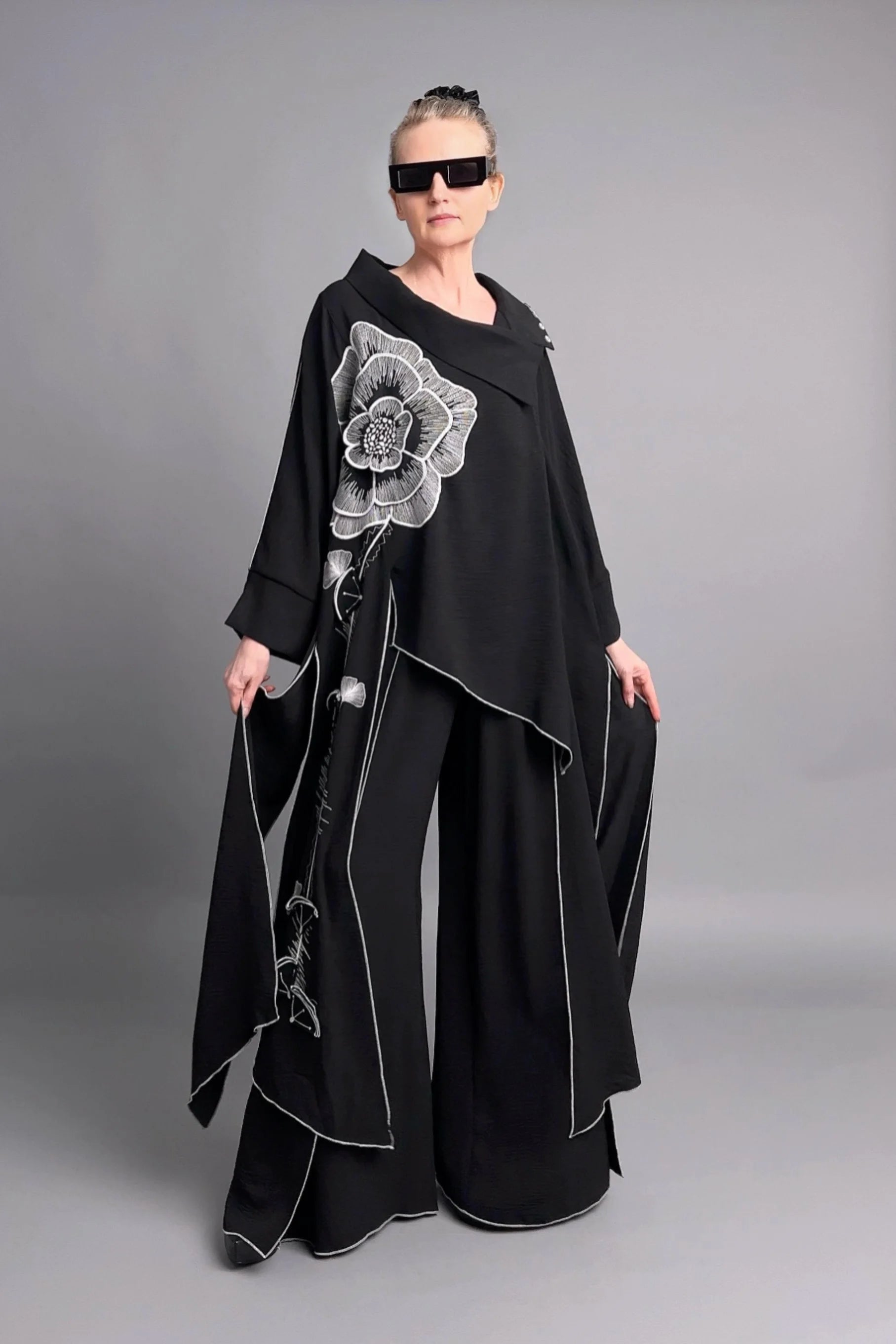 Ein avantgardistisches Set für kreative Looks: Der Riberance Zweiteiler kombiniert eine kunstvoll bestickte Longtunika mit einer weich fallenden, weit geschnittenen Hose. Das schwarze Ensemble mit elfenbeinfarbenen Details vereint Leichtigkeit, Komfort und Designanspruch – ideal für stilvolle Übergangslooks mit Ausdruck.