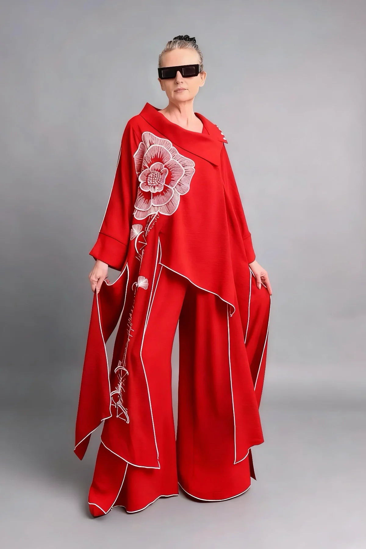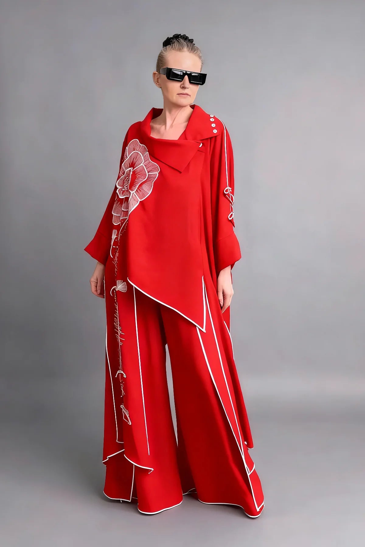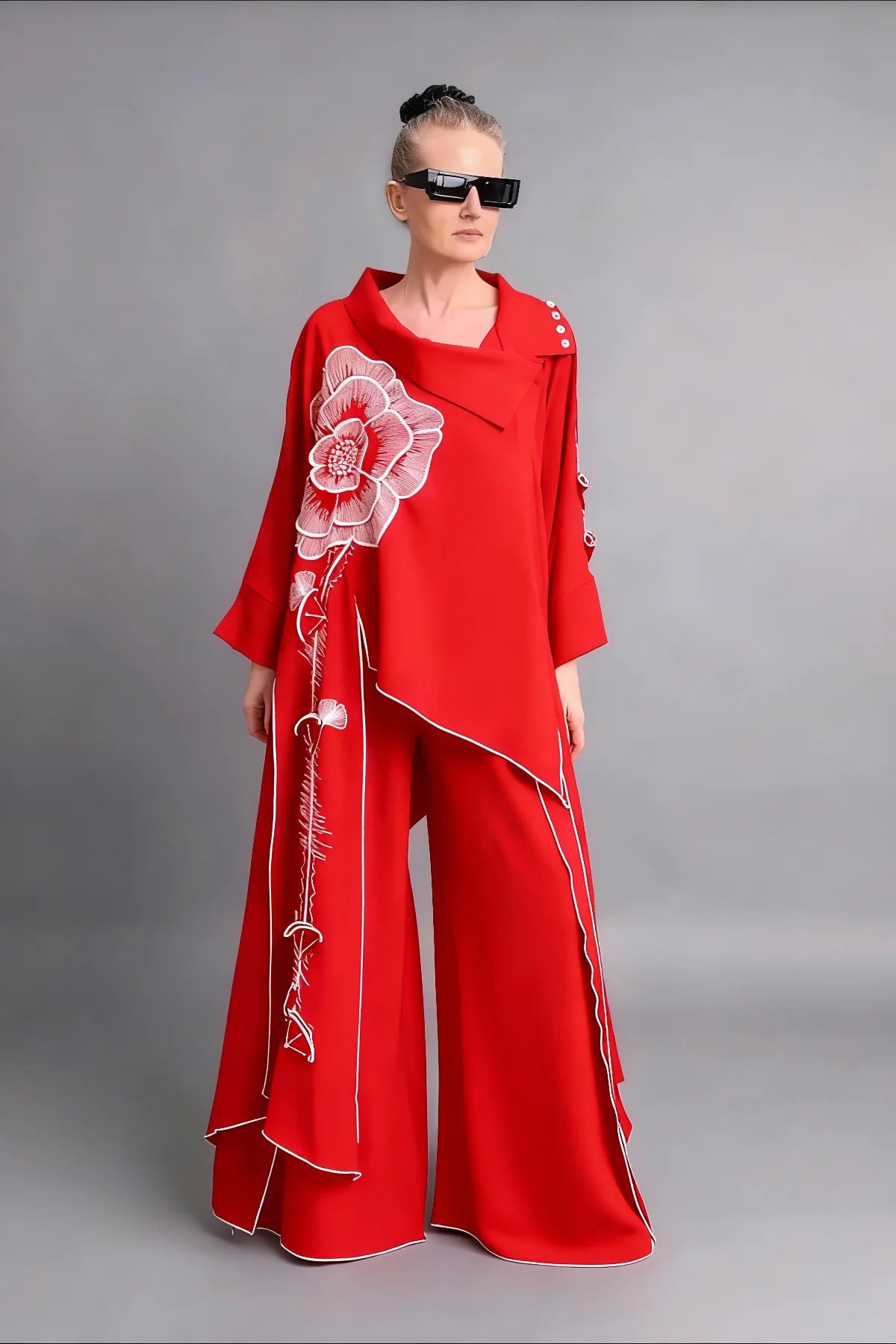 Riberance Zweiteiler mit floraler Stickerei in Rot-Weiß mit asymmetrischer Tunika