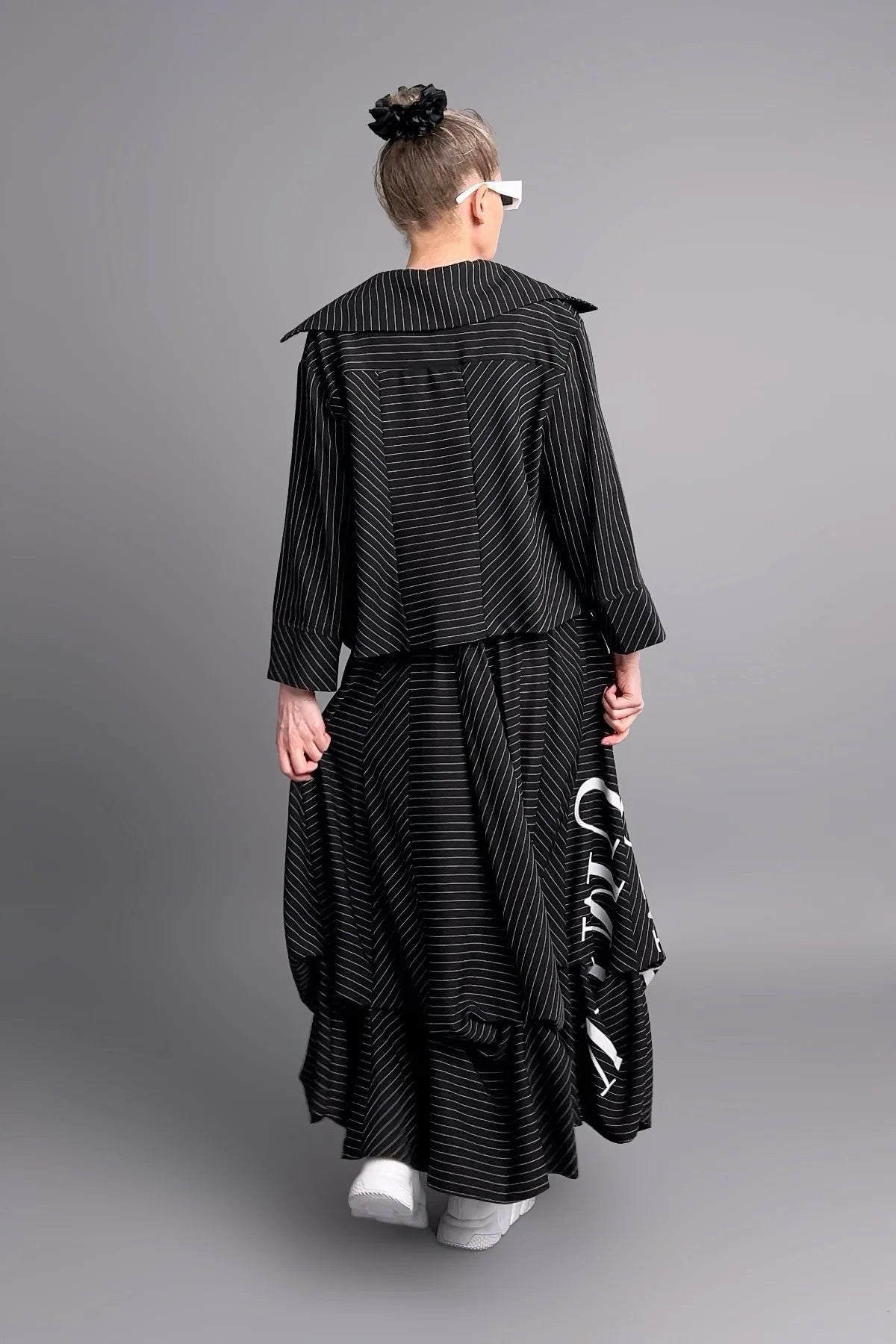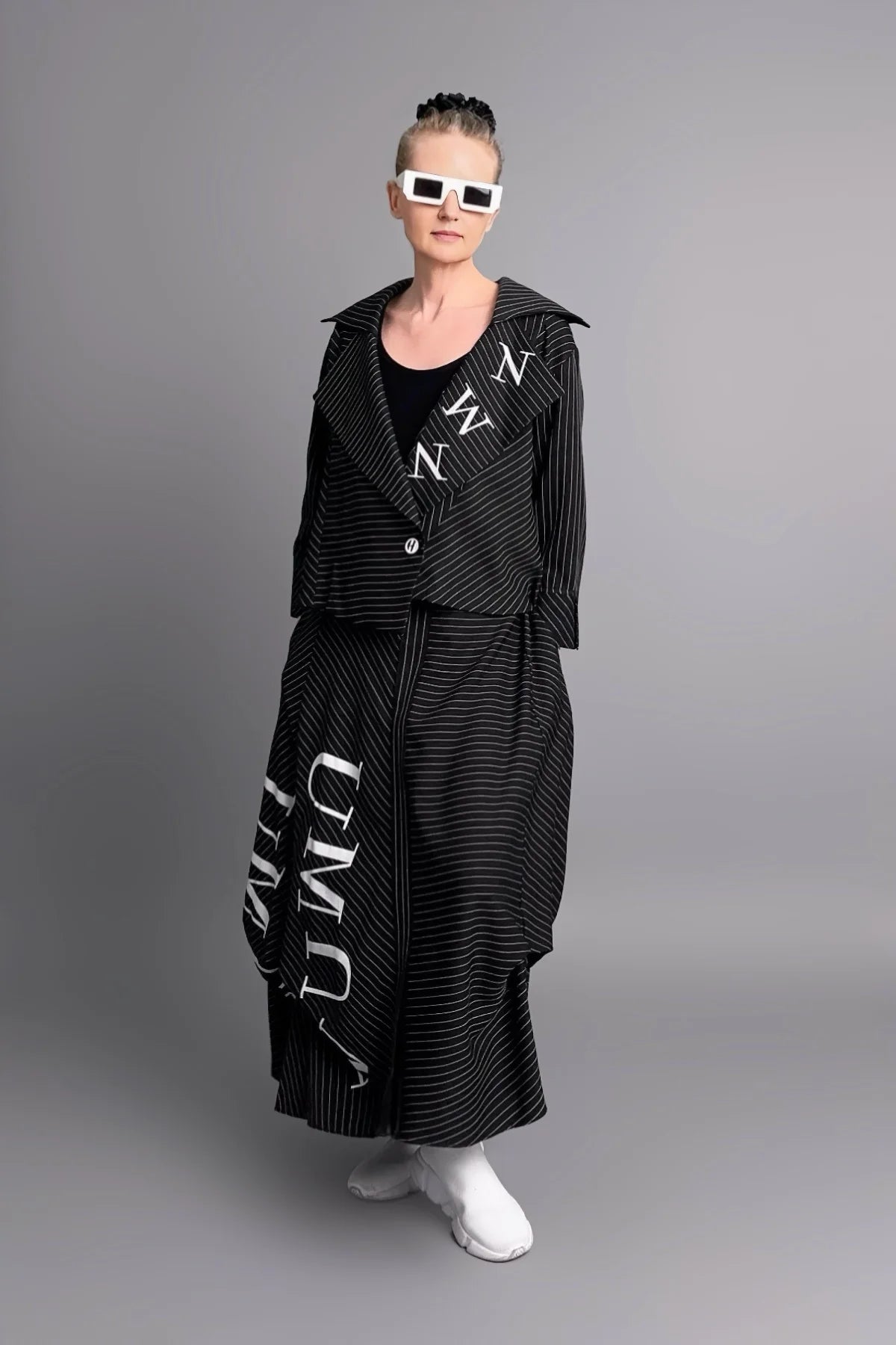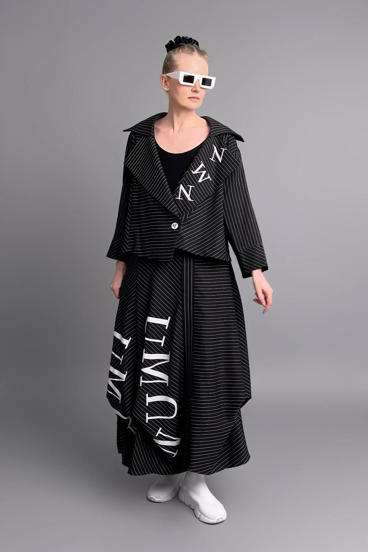 Ein stilvolles Ensemble im modernen Lagenlook: Dieses 2-teilige Set aus fein strukturierter Leinenoptik kombiniert eine verkürzte Jacke mit einem fließenden Rock – veredelt durch weiße Buchstabenprints. Der urbane Look wird durch das leichte, glatte Material und den monochromen Kontrast perfekt unterstrichen.