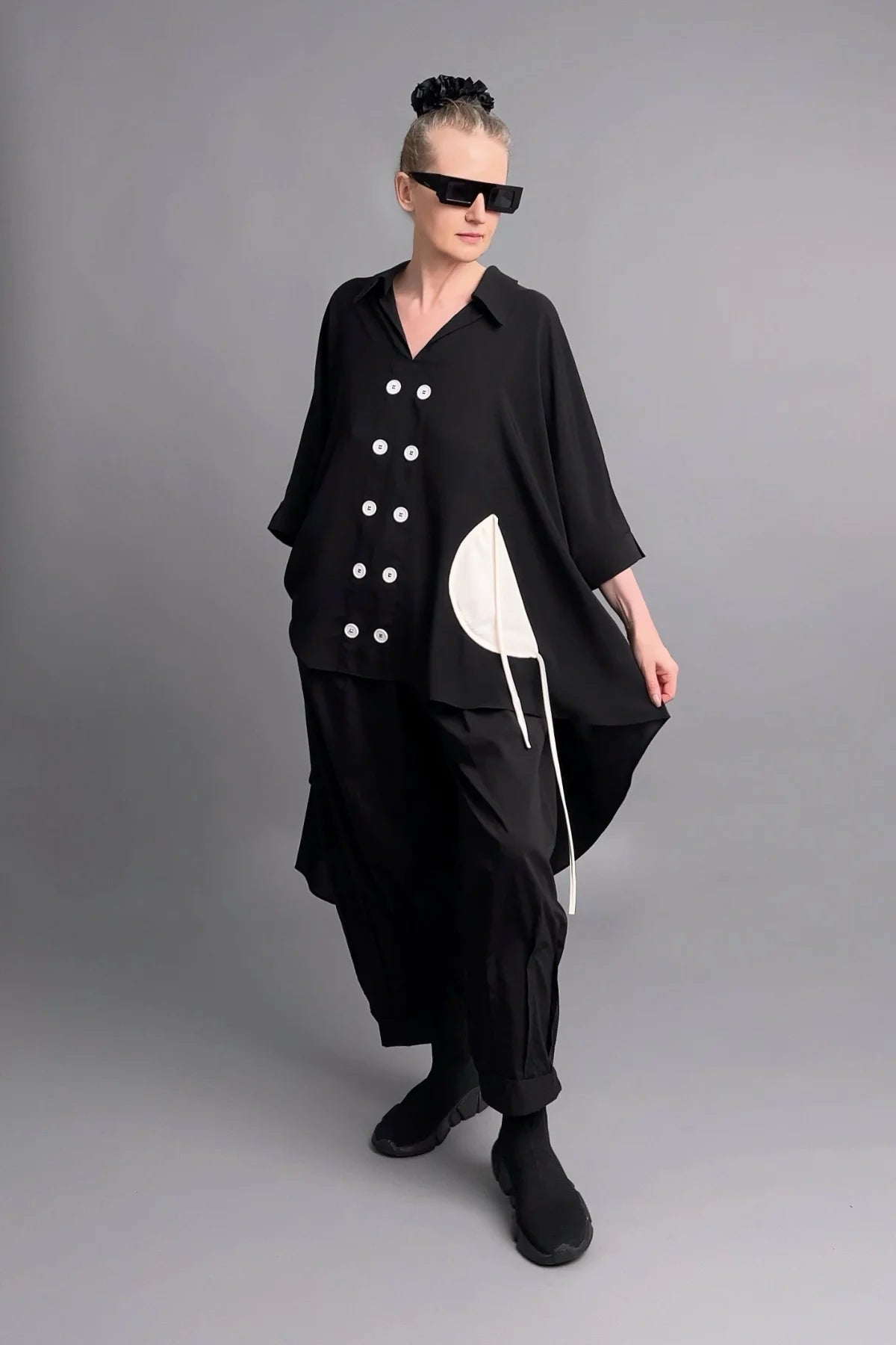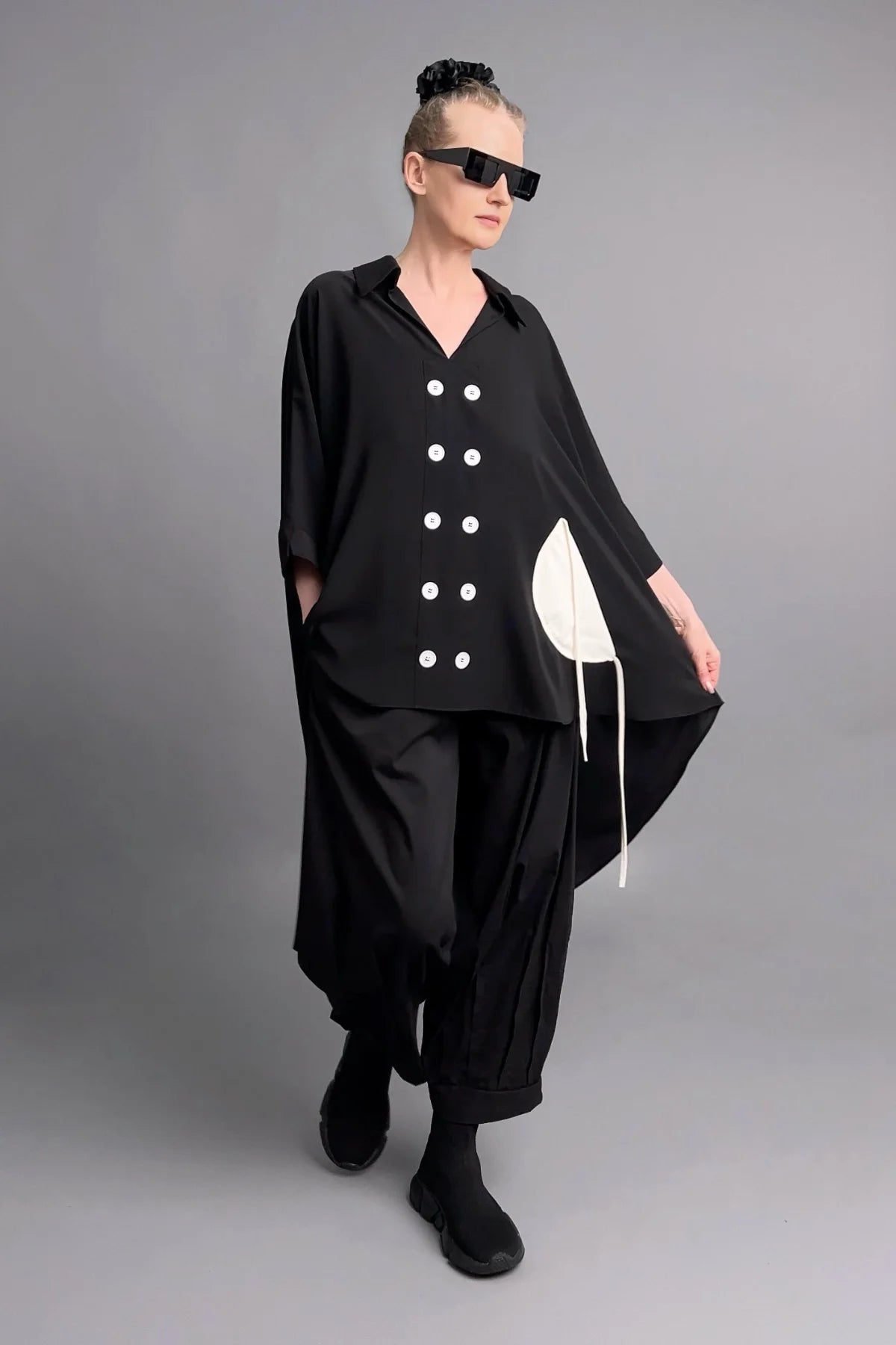 Ein avantgardistisches Highlight mit Charakter: Diese fließende Tunika aus hochwertigem Slinky-Material überzeugt durch asymmetrische Linienführung, doppelte Knopfleiste und runde Kontrastapplikationen in Weiß. Die moderne Oversize-Silhouette in tiefem Tinten-Schwarz macht dieses Piece zum idealen Statement für kreative City-Looks – luftig, leicht und stilvoll.